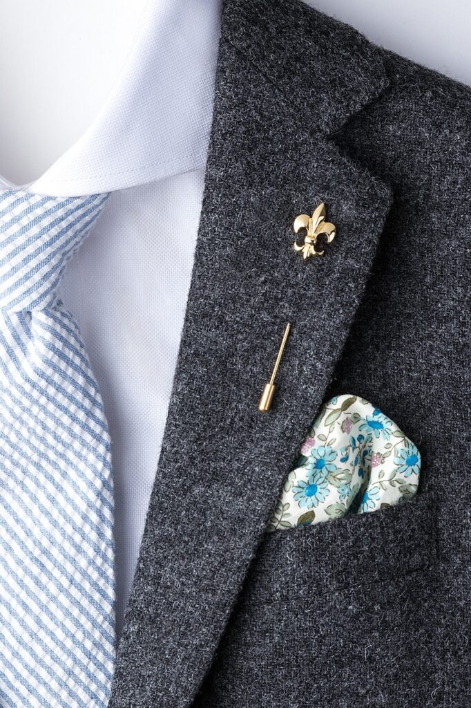 - Đây là một trong những loại ghim phổ biến nhất trong thời trang nam giới hiện đại. Ghim hình hoa, thường được làm từ vải (như lụa, satin) hoặc kim loại cao cấp, tạo cảm giác tinh tế và mềm mại, giúp cân bằng sự cứng nhắc của bộ vest.
