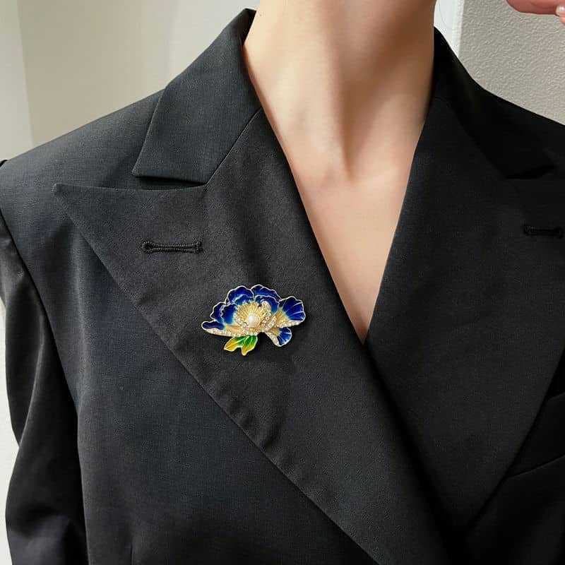 Điểm nhấn của trâm cài áo là những viên ngọc trai tự nhiên, sáng lấp lánh, được đính kết khéo léo trên những cánh hoa mẫu đơn xanh được tráng men tinh xảo. Sự kết hợp hài hòa giữa sắc xanh thanh lịch và vẻ đẹp tinh khiết của ngọc trai tạo nên một món trang sức vừa sang trọng, vừa quý phái.