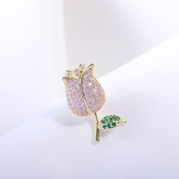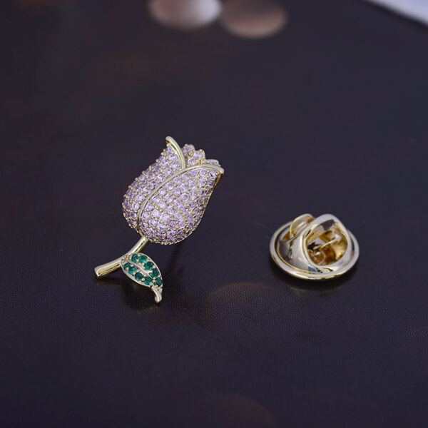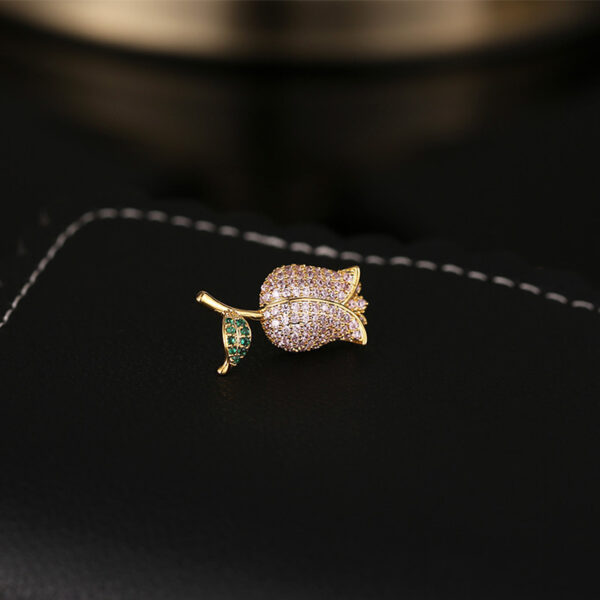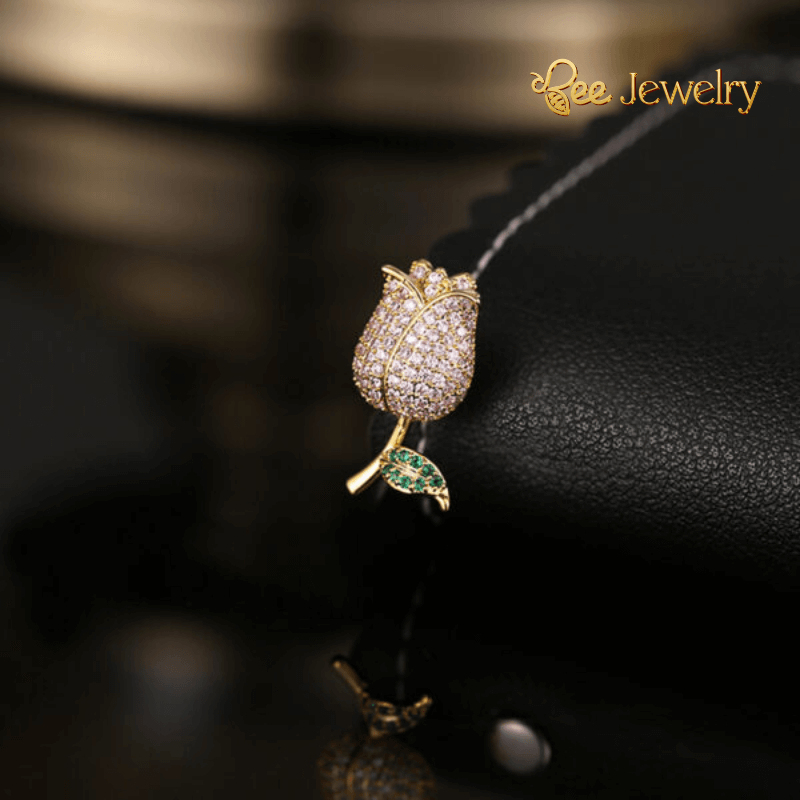 Hãy tưởng tượng, trên nền áo sơ mi mềm mại, hay trên chiếc blazer trang nhã, chiếc cài áo nụ hồng khẽ đậu, tỏa sáng dịu dàng. Hình ảnh nụ hồng, biểu tượng của sự tươi mới, trẻ trung và tình yêu chớm nở, được tái hiện một cách tinh tế, với những đường nét mềm mại và uyển chuyển. Những viên đá kim cương nhân tạo cao cấp sáng bóng được đính kết khéo léo, tạo nên hiệu ứng lấp lánh đầy mê hoặc, thu hút mọi ánh nhìn.