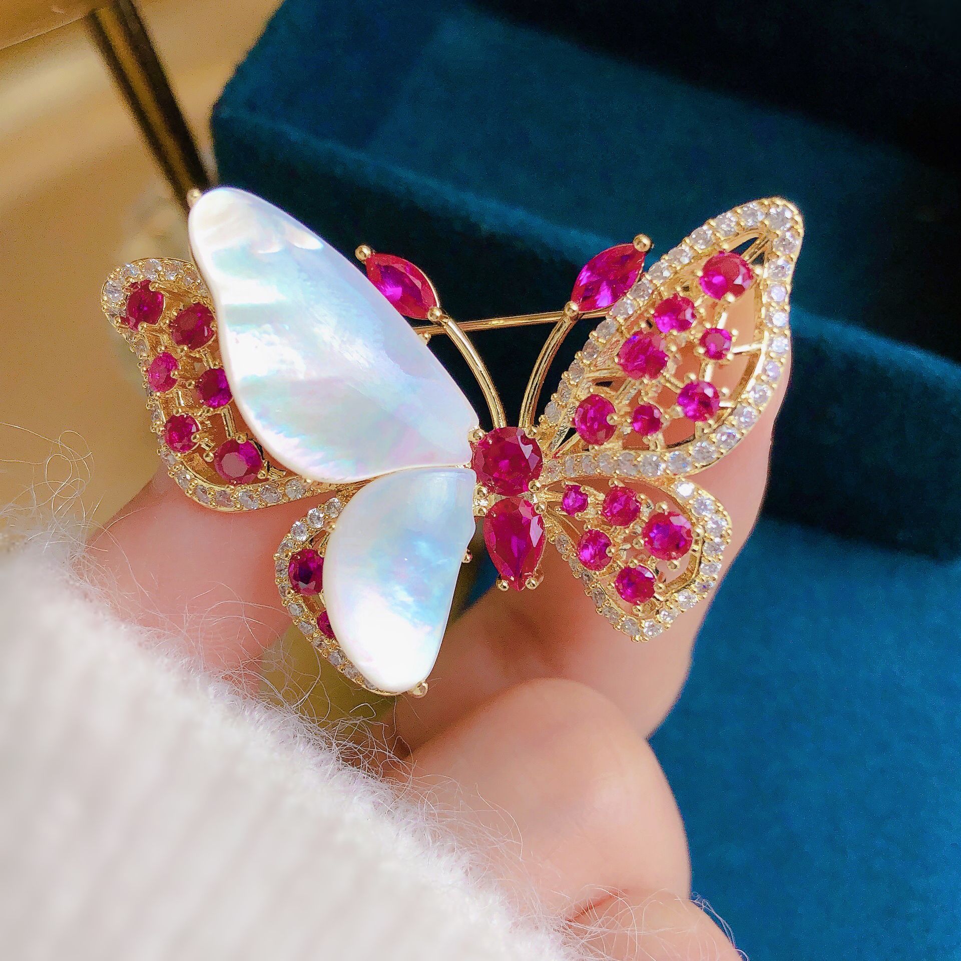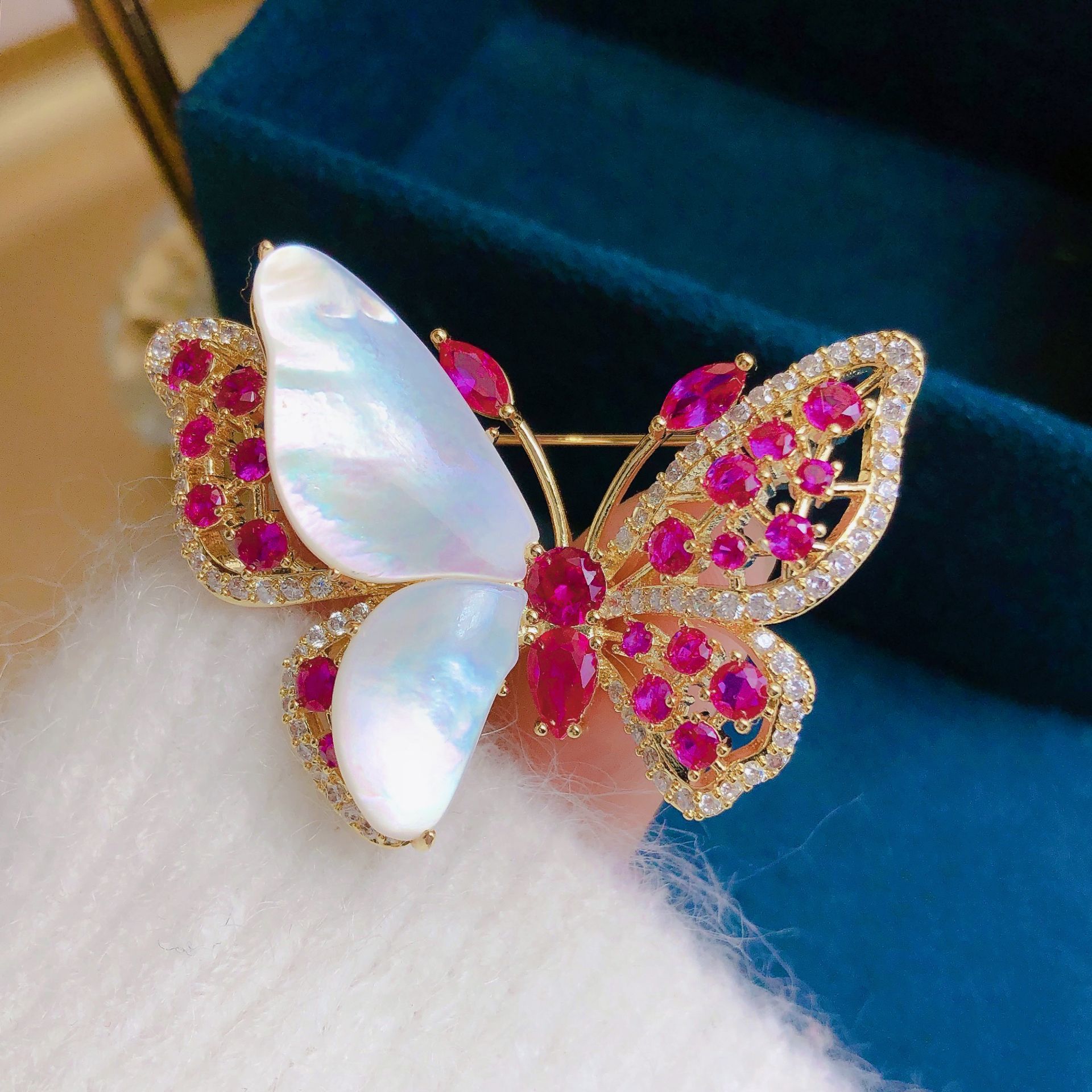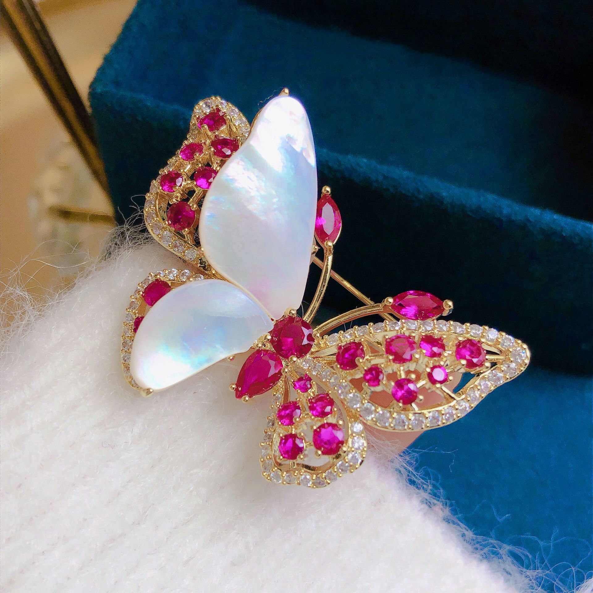 Loại đá: Đá ruby hồng cao cấp, 1 phần cánh bướm được làm từ vỏ ốc xà cừ quý hiếm, thiết kế tinh xảo, thanh lịch sang trọng