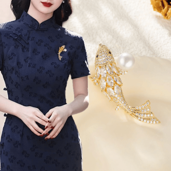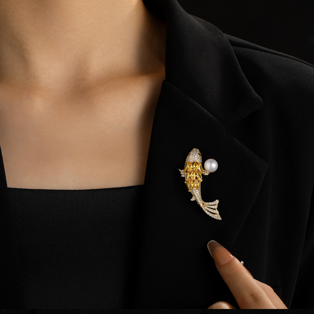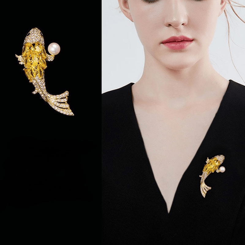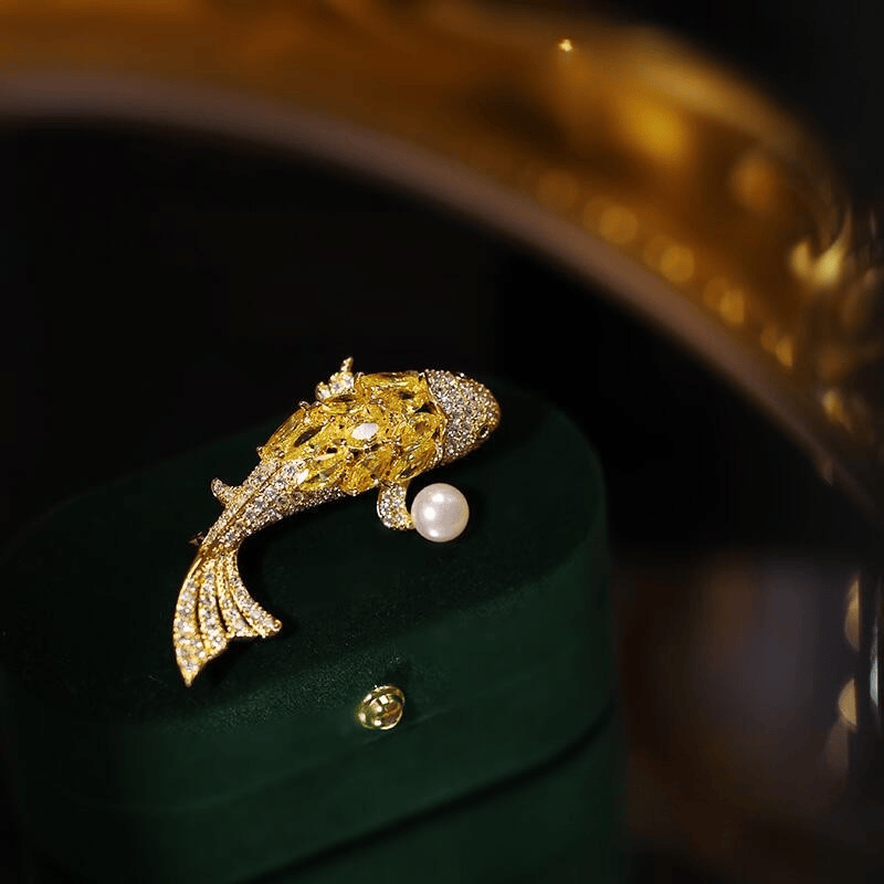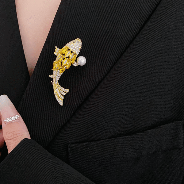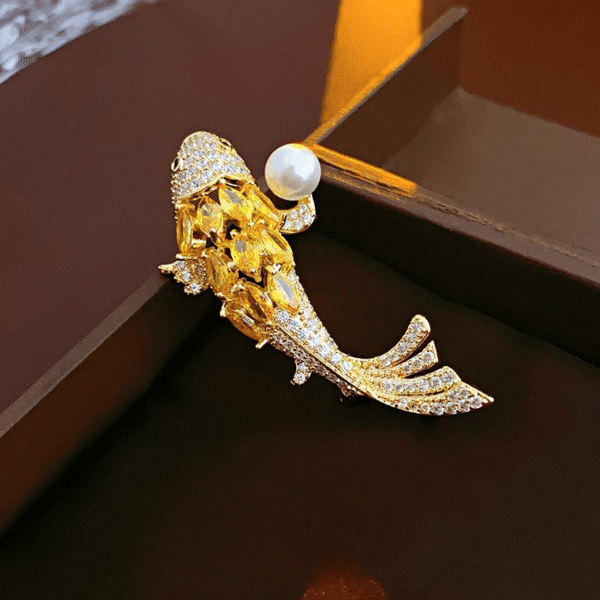 Vẻ Đẹp Vượt Thời Gian: Phụ Kiện Cài Áo Cá Koi Pha Lê Vàng Đính Ngọc Trai – Biểu Tượng Của Sự May Mắn