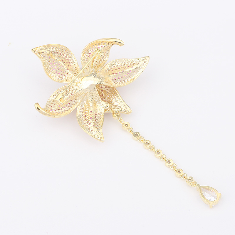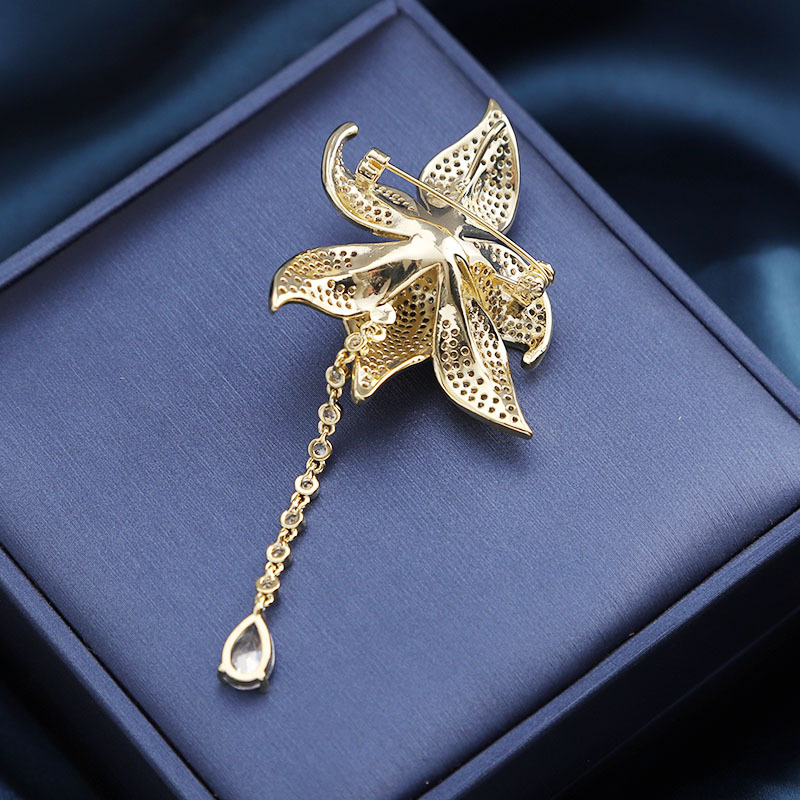Phụ kiện cài áo hoa lily được chế tác từ hợp kim cao cấp, trải qua quá trình xử lý bề mặt mạ điện vàng 18K chắc chắn, giữ màu sắc sáng bóng lâu dài. Những cánh hoa lily được thiết kế tỉ mỉ, mềm mại, uyển chuyển, toát lên vẻ đẹp tự nhiên và tinh tế.