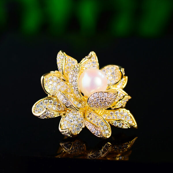 Điểm nhấn đặc biệt của chiếc Cài áo hoa sen vàng là viên ngọc trai tự nhiên cao cấp, được lựa chọn kỹ lưỡng, sở hữu màu sắc rực rỡ, độ rút rút hoàn hảo. Những viên đá kim cương nhân tạo cao cấp được cắt mài thủ công tinh tinh, tán sắc rực rỡ, càng làm tăng thêm vẻ quan trọng và quý phái cho món trang sức sức.