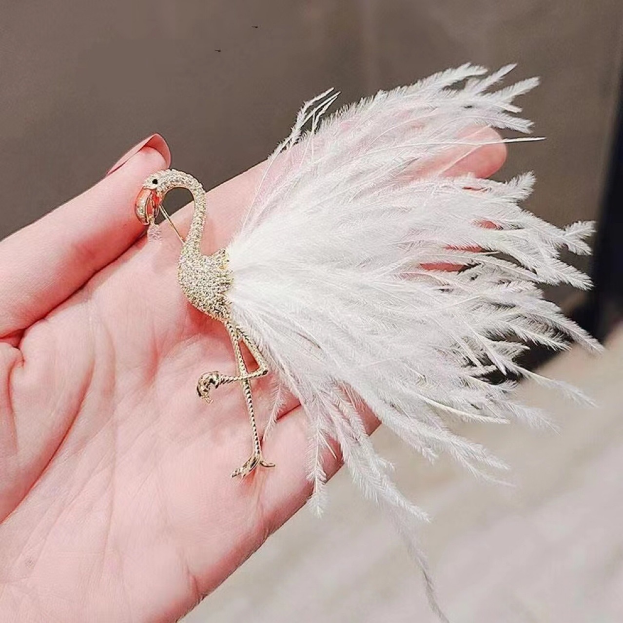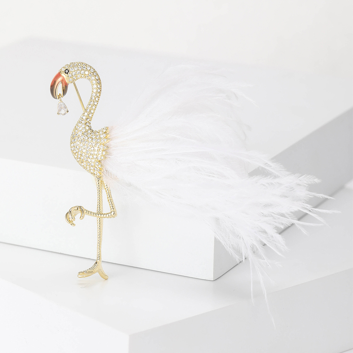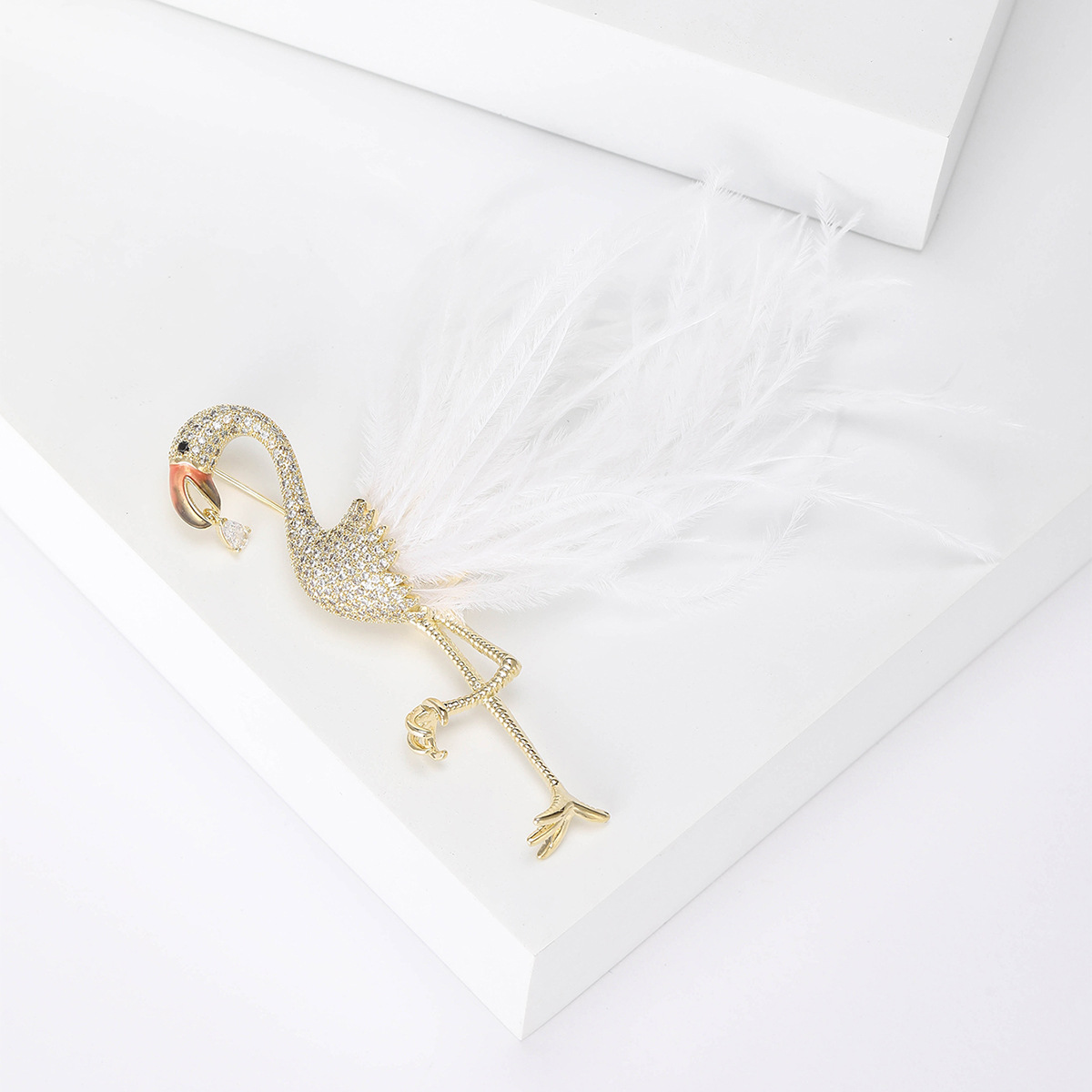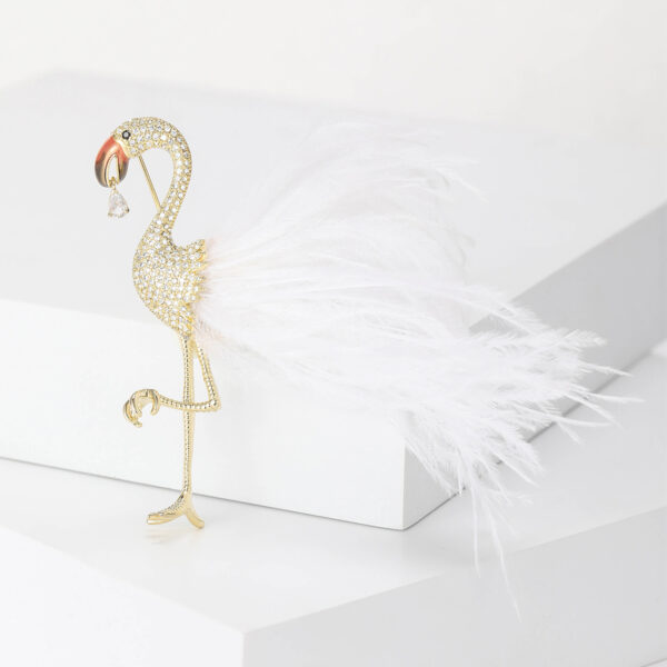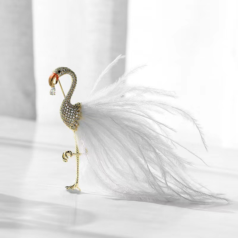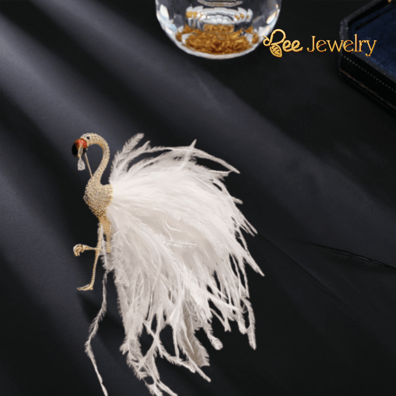 Trâm Cài Áo Hồng Hạc Lông Vũ Trắng Đính Đá