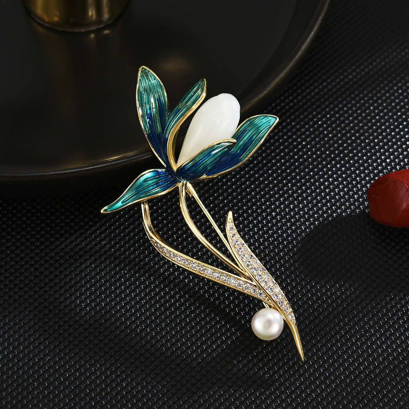 Chiếc trâm cài áo ngọc bích mang đến vẻ đẹp tinh tế và thanh lịch, được chế tác từ hợp kim cao cấp với lớp mạ vàng 18k sang trọng. Thiết kế lấy cảm hứng từ bông hoa ngọc bích thanh thoát, với các cánh hoa màu xanh biếc tươi mát và nhụy hoa là ngọc trai nhân tạo trắng tinh khiết, tạo nên sự hài hòa hoàn hảo. Phần thân của trâm được đính những viên đá nhỏ lấp lánh, càng tôn lên vẻ đẹp rực rỡ và quý phái.